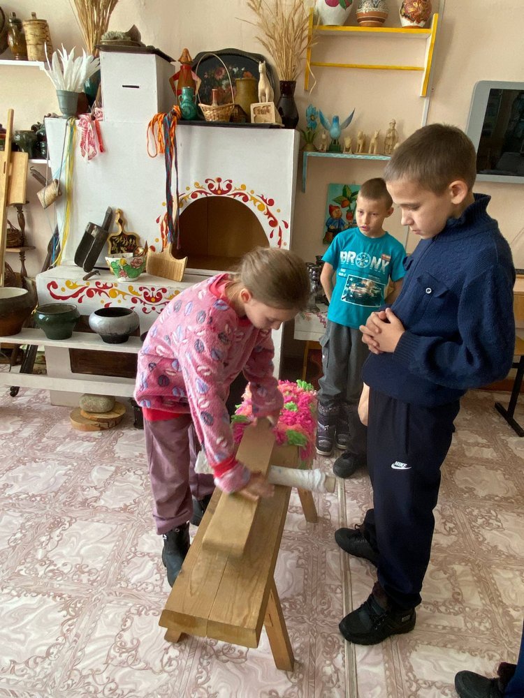 Во время занятия воспитанники познакомились с главным атрибутом русской избы — печкой. Ее ролью в жизни человека. В печи готовили пищу, использовали как баню, на печи спали. Ребята попробовали ухватом поставить в печь чугун, поработать лопатой для выпечки хлеба. С интересом прослушали рассказ об эволюции утюга от рубеля до электрического. С большим азартом гладили салфетку рубелем стараясь достичь наилучшего результата. Не обошлось и без важного предмета в быту русского человека самовара угольного. Рассмотрели до мелочей. Узнали новые слова: конфорка, верток. И конечно поговорили об истории ниток. Ребята узнали, что на Руси нити пряли из льна, конопли, шерсти и даже крапивы. Понаблюдали как прядут нить на веретене. Показ замечательно представила Катя Дегтярева. И, конечно, все оценили скорость прядения на самопрялке по сравнению с веретеном. Во время нашего «путешествия» нас сопровождали воспитанницы седьмой семьи Настя Хамина и Катя Дегтярева. Они демонстрировали как употреблялись тот или иной предмет в быту во время рассказа экскурсовода.